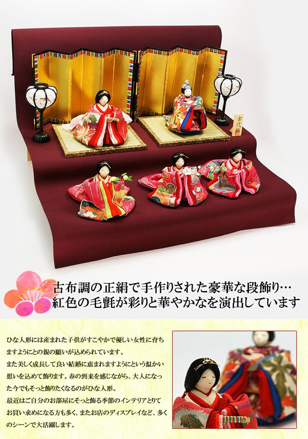 全体サイズ全体(横幅54×奥行42×高さ34cm)女雛サイズ女雛(横幅16×奥行16×高さ11cm)素材正絹・圧縮木(段)セット内容お雛様・三人官女・金屏風(2枚)・ぼんぼり(一対)・い草畳(2枚)・飾り台・毛氈・箱入り注意事項製作面での都合上、生地の柄がお写真と異なる場合がございますがご了承ください。