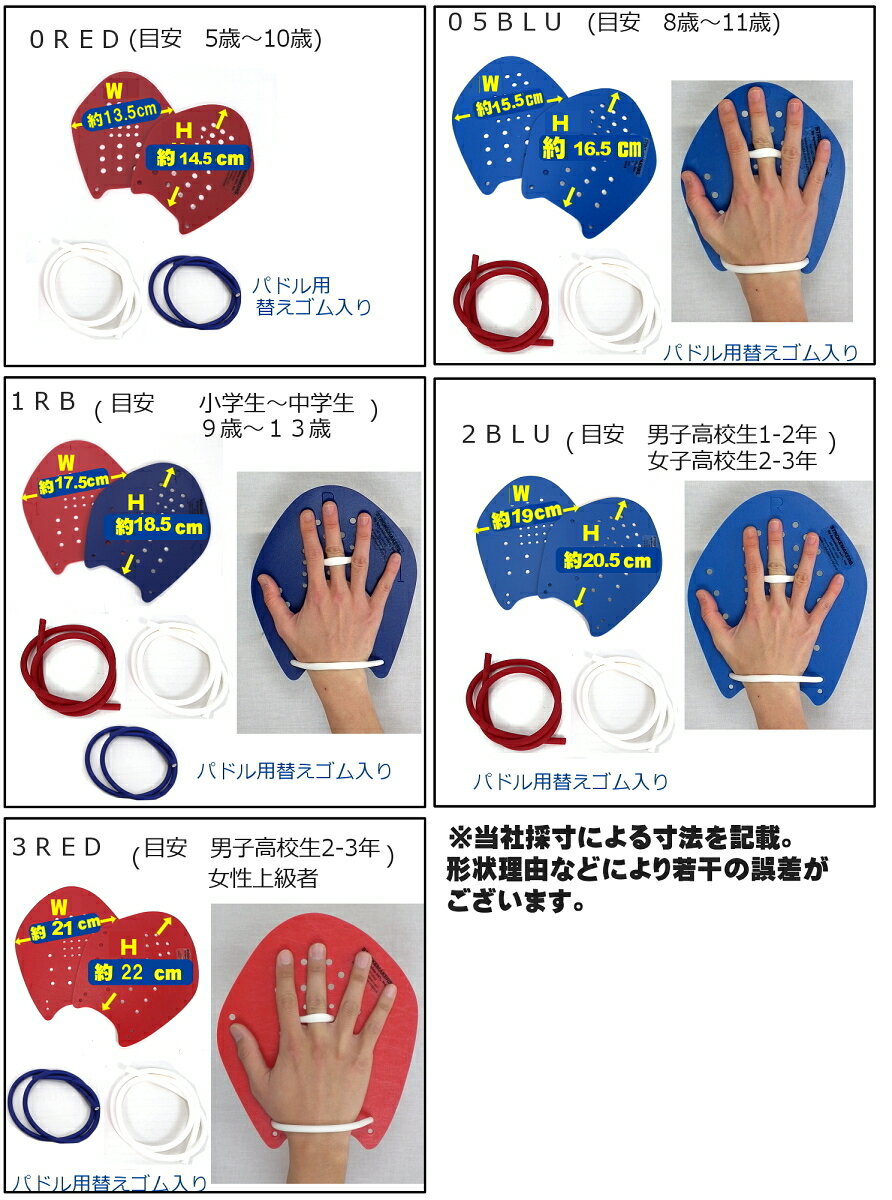 ■使用の目安 0RED(レッド×レッド)ジュニアサイズ小学生(5歳〜10歳) W13.5cm×H14.5cm 05BLU(ブルー×ブルー)小学生低〜高学年(8歳〜11歳) W15.5cm×H16.5cm 1RB(レッド×ブルー)高学年〜中学生(9歳〜13歳) W17.5cm×H18.5cm 2BLU(ブルー×ブルー)中学生以上・成人スイマー用 W19cm×H20.5cm 3RED(レッド):中学・高校生以上・競技レベルスイマーにおすすめ。